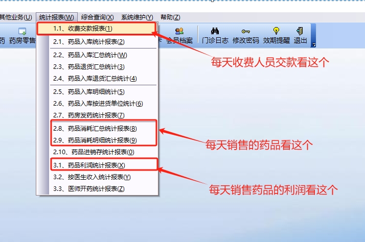 每天收费人员的交款报表,诊所销售的药品和库存,药品利润等报表软件中有吗?