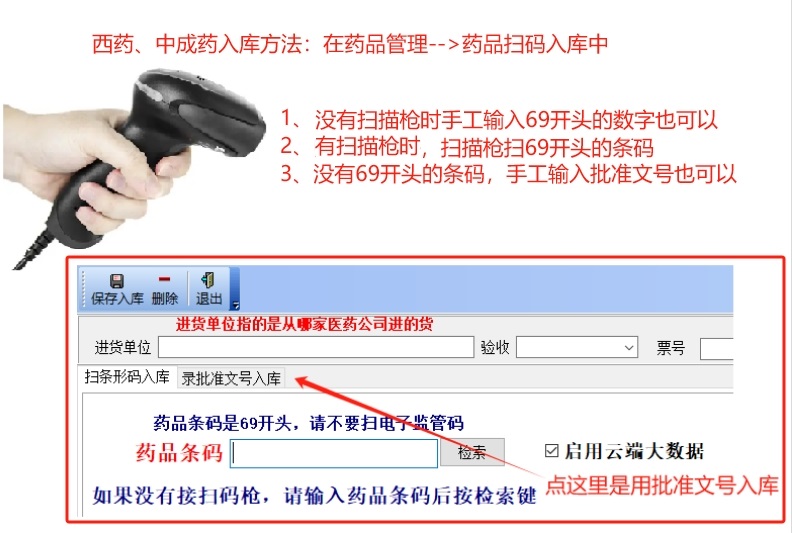 对于西药、中成药等有69条码开头的药品,或有批准文号的药品,建议用扫码入库,对于即没有条码也没有批准文号的药品,可以用普通入库。